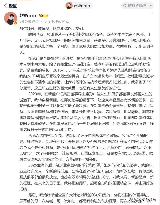 8月30日消息,8月29日,新疆男篮后卫赵睿正式加盟了北京首钢男篮。8月30日,赵睿在社交媒体上发长文致谢了一路走来的恩师贵人,特别提到了新疆2年对自己的照顾。