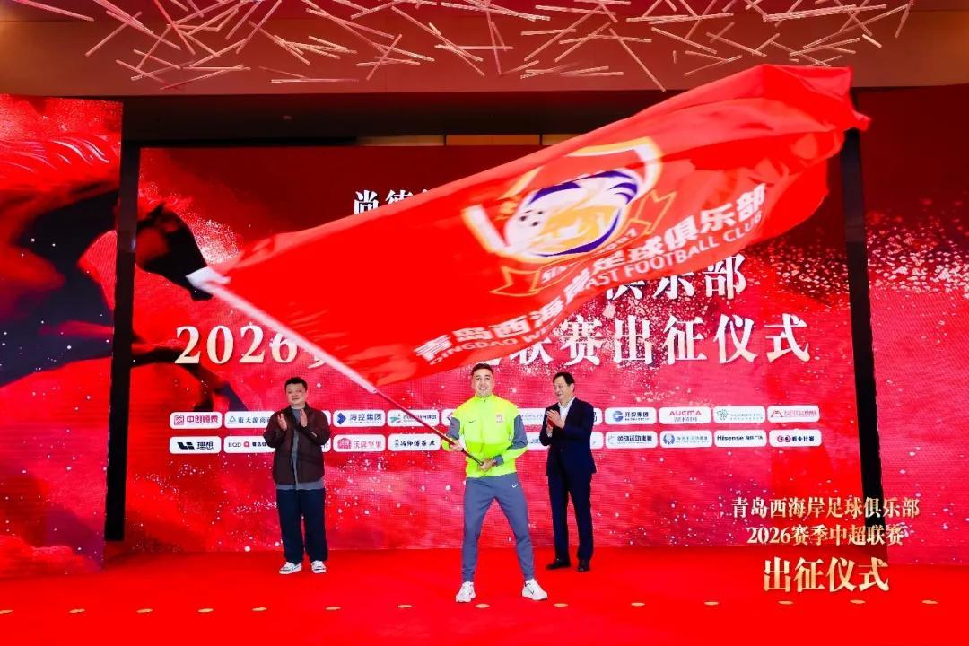 尚德笃行,智启新程。3月4日,青岛西海岸足球俱乐部2026赛季中超联赛出征仪式在青岛石灿酒店希尔顿格芮精选酒店“凯旋厅”成功举行。青岛市人大常委会副主任、市总工会主席张建刚,青岛市副市长赵胜村,市政府办公厅副主任慕建光,青岛市体育局党组书记、局长蔡全记,青岛广播电视台党委书记、台长、青岛广电影视传媒集团有限公司董事长谭鹏,青岛市足球协会主席杨鹏鸣,青岛市足球协会常务副主席、秘书长、市足球运动管理中心主任田卫国,区人大常委会副主任曲波,区政府党组成员、副区长赵英民,区政府党组成员、副区长傅强,青岛自贸片区管委副主任秦禾,区教育和体育局党组书记、局长宗武邦,区教育和体育局党组成员、教育和体育事业发展中心主任王新峰,区总工会党组书记、常务副主席封伟,青岛西海岸足球俱乐部董事长徐尚,中国足坛名宿、俱乐部总顾问赵书田,副董事长蓝立宁,总经理申军,俱乐部党支部书记王天庆,主教练郑智,副总经理葛振,以及青岛西海岸新区海洋控股集团副总裁、青岛西海岸体育产业发展集团执行董事王皓,青岛开发区投资建设集团有限公司副总经理刘鹏,青岛西海岸体育产业发展集团总经理潘鹏,青岛西海岸旅投集团副总经理徐潇玲,青岛黄发集团商业公司总经理孙超群,青岛金天信科企业服务有限公司董事长金鹏,青岛国瑞体育文化产业有限公司董事长宫瑞华、海信广场赵路通、理想汽车唐菲、冯师傅茶业冯玉冰、班嘉隆葡萄酒洪勋、陈医生运动康复陈斌、领动运动康复赵震等赞助商领导嘉宾莅临现场。和俱乐部一线队全体教练员、队员和工作人员以及媒体和球迷共三百余人共同见证俱乐部向新赛季挥旗出征。
